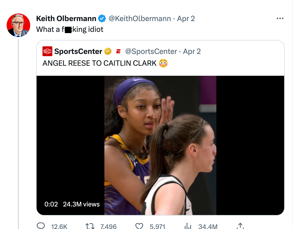 \u201cI apologize for being uninformed last night about the back story on this. I don't follow hoops, college or pro, men or women. I had no idea about Clark. Both were wrong.\n\nThis is what I said in today's Countdown podcast. 2nd segment, about 24 minutes in: https://t.co/JDYjXBrkWy\u201d— Keith Olbermann (@Keith Olbermann) 1680473156