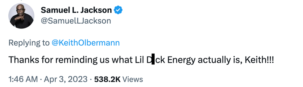 \u201c@KeithOlbermann @SamuelLJackson Yeah but you called the black one a name \u201cDon\u2019t Insult our Intelligence \u201c\u201d— Keith Olbermann (@Keith Olbermann) 1680473156