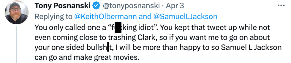 \u201c@KeithOlbermann @SamuelLJackson you're a fu@king idiot..\u201d— Keith Olbermann (@Keith Olbermann) 1680473156