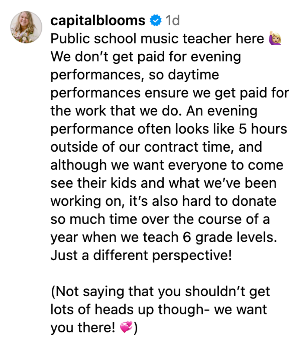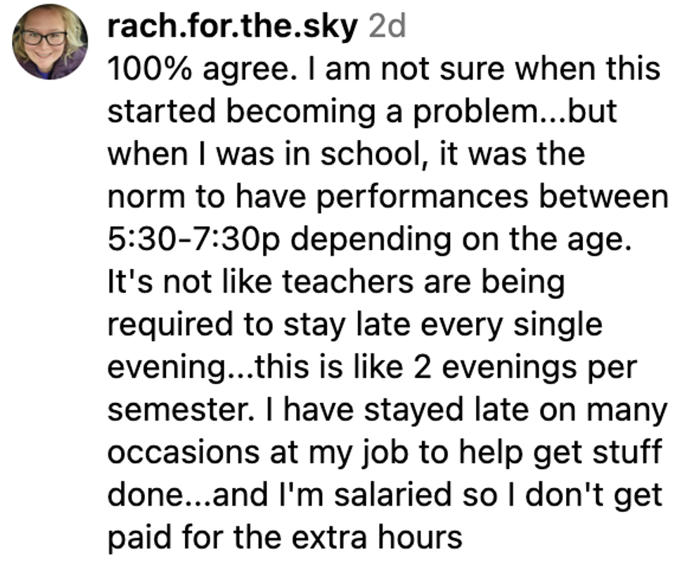 Many teachers pointed out how holding performances outside of school hours would also mean teachers working extra hours in the day, for which they wouldn't be paid, while also highlighting how criminally underpaid teachers are to begin with, and others pointing out getting children to and from school for performances after hours is challenging for many parents and students: