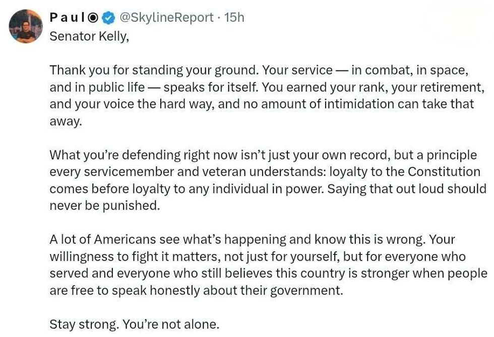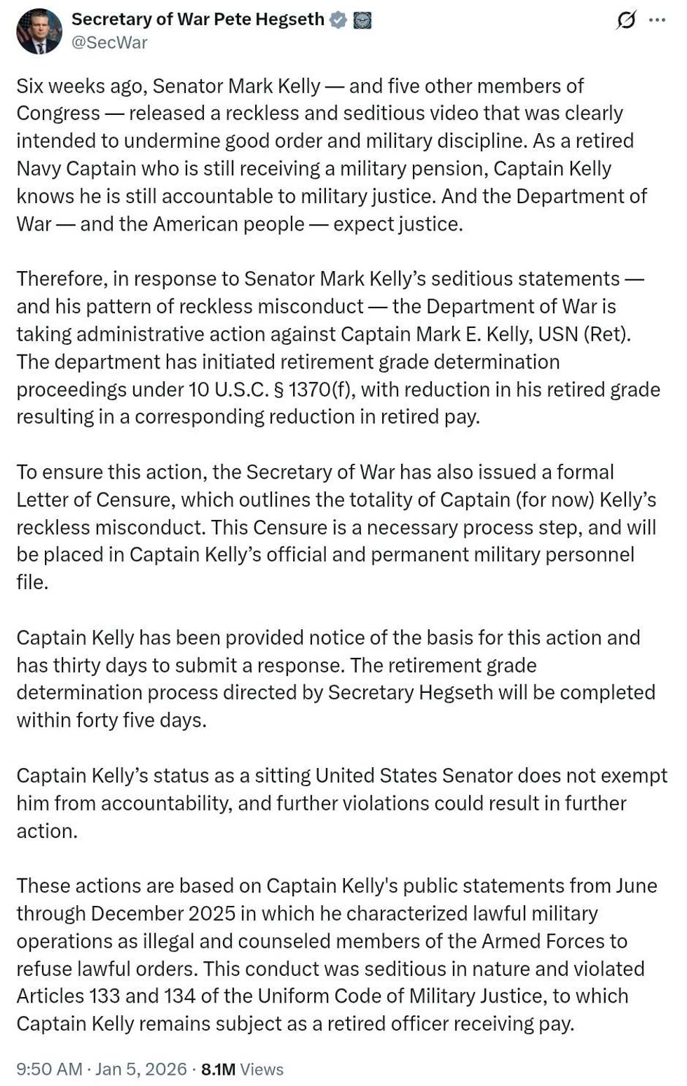 In his own X post, using a legitimate title, Senator Kelly stated: