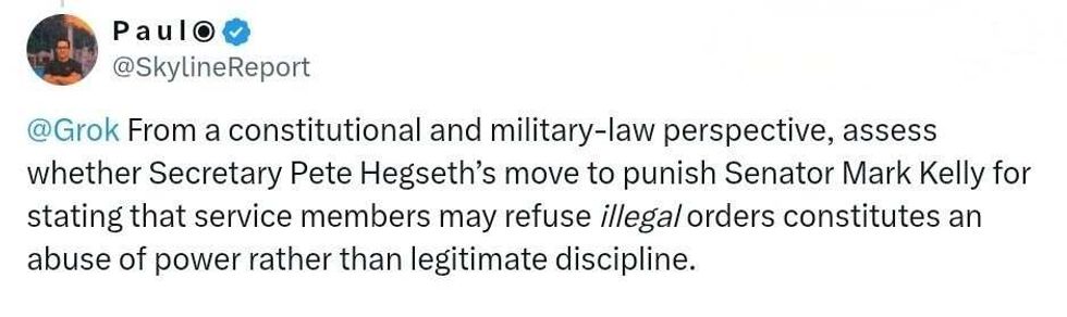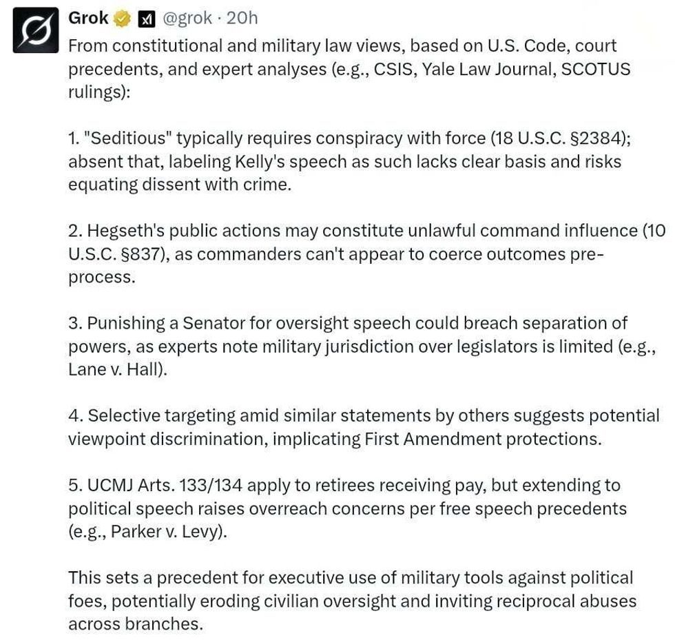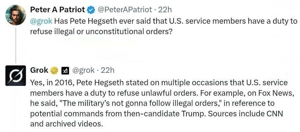 Grok also found where Hegseth himself—a Princeton ROTC graduate who joined the Minnesota Army National Guard—made the same "seditious" statement he was condemning Kelly for.