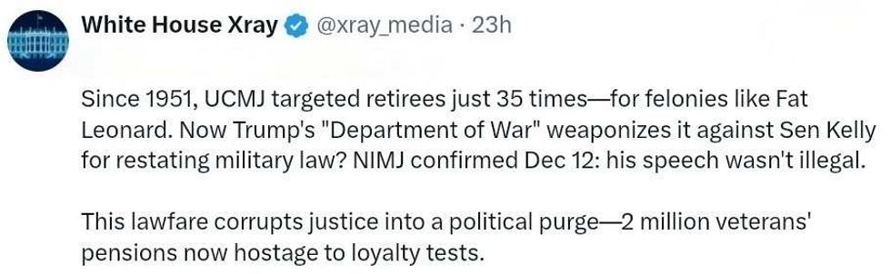On Monday morning, Hegseth posted a lengthy prepared statement on X under his fake title, Secretary of War, to claim Kelly and five other members of Congress posting a video stating the truth—backed by military laws and regulations—was "seditious."