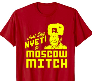 The Kentucky Democratic Party first hawked paraphernalia using the phrase "Just say Nyet to Moscow Mitch" on a red T-shirt with a picture of McConnell wearing a Cossack hat emblazoned with the hammer and sickle symbol.
