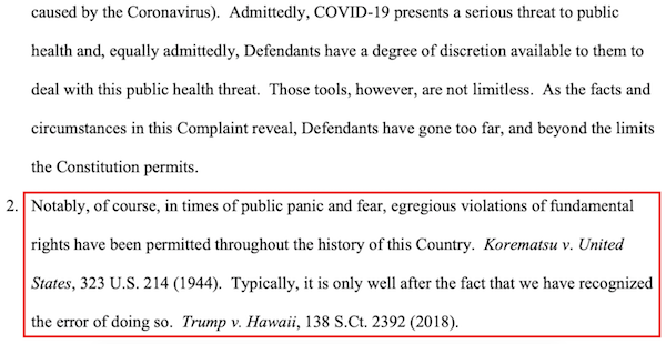 Then to drive their point home, the parishioners claimed being asked to worship without gathering in person—thereby violating social distancing guidelines and endangering the public—was the same as Japanese Americans losing their homes, businesses and personal possessions and being interred for years during World War II.