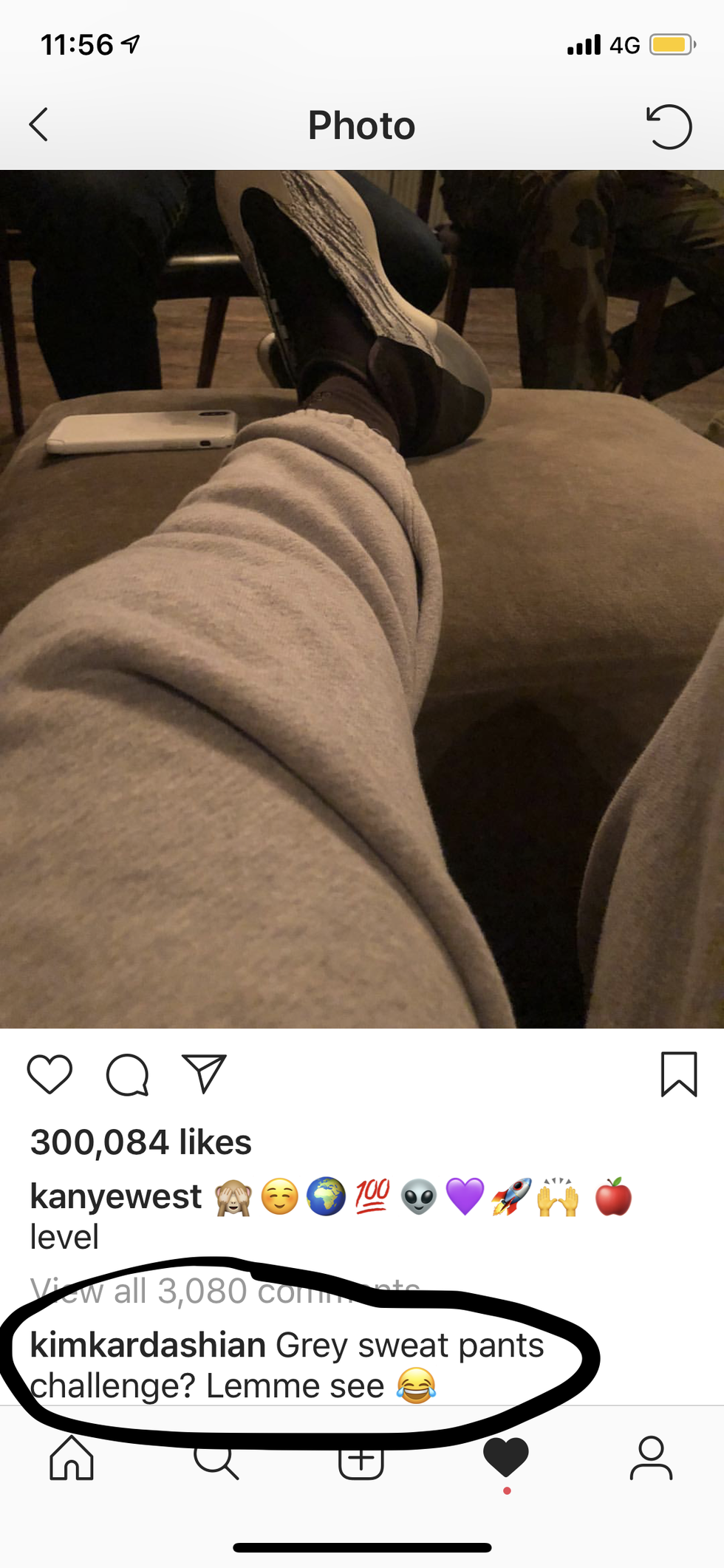 What is the "grey sweat pants challenge" and why does Kim want to see?
