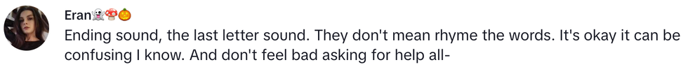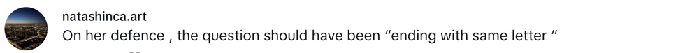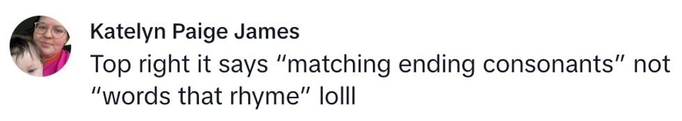 The creator did post a follow-up video revealing she was looking for rhyming matches instead of words with the same final sound, noting: