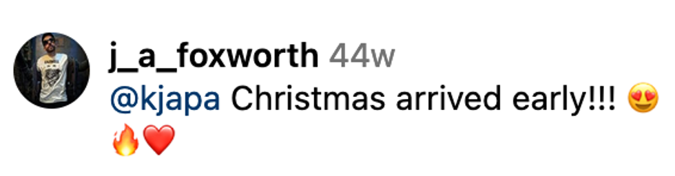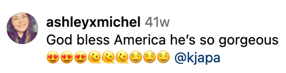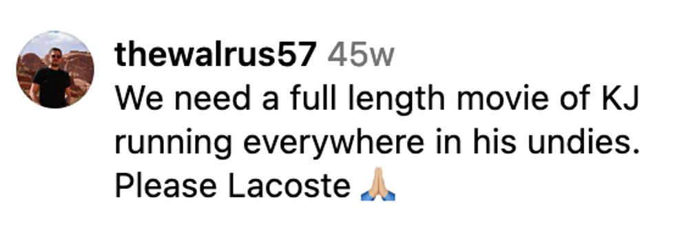 Playing on the notion there was a demand for more shirtless KJ Apa content for gay fans, this alternate take from the same stairwell in the commercial was shared on the Beautiful Male Celebrities Instagram page.