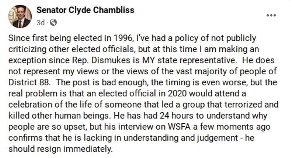 GOP Alabama State Senator Clyde Chambliss expressed his outrage on Facebook.