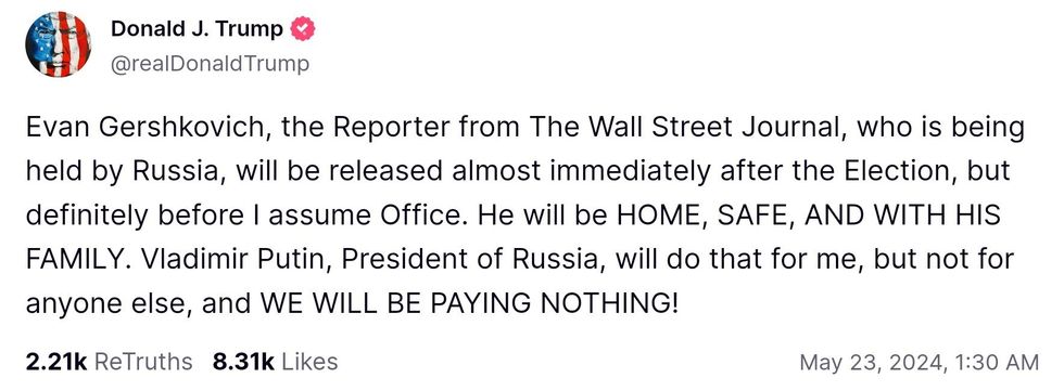 "Evan Gershkovich, the Reporter from The Wall Street Journal, who is being held by Russia, will be released almost immediately after the Election, but definitely before I assume Office. He will be HOME, SAFE, AND WITH HIS FAMILY."