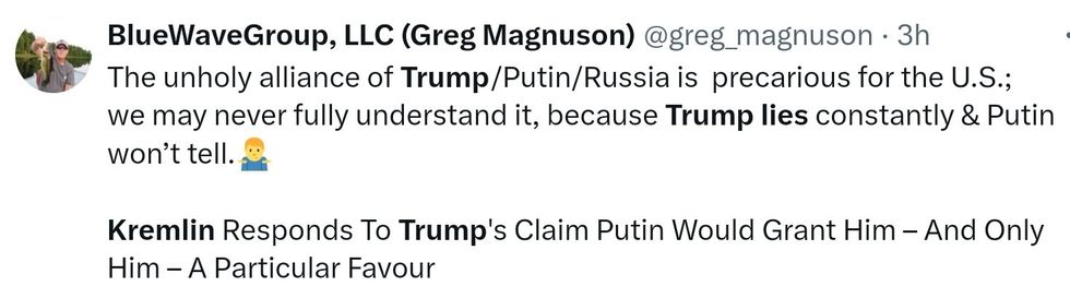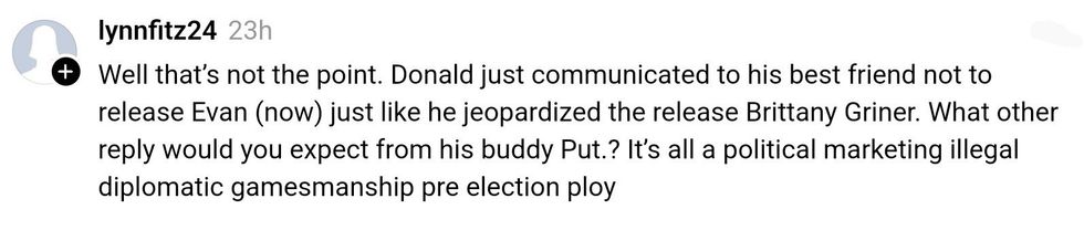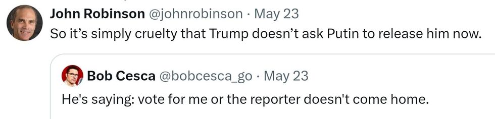 Trump doesn't give half a sh*t about Gershkovich; he wants credit for freeing him or else he can die. Trump doesn't care. Oh, and bragging about your close relationship to the murderous tyrant Putin isn't the flex he obviously thinks it is.