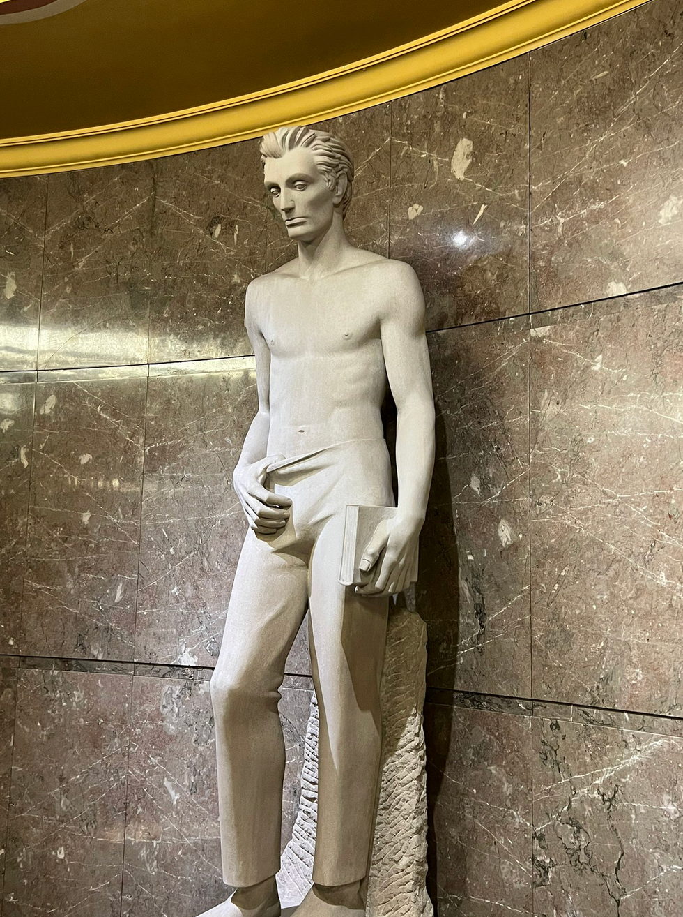 The statue exemplifying the public art of the New Deal can be found in the Los Angeles Spring Street Courthouse, where it has stood since 1941 and has gone viral in recent years.