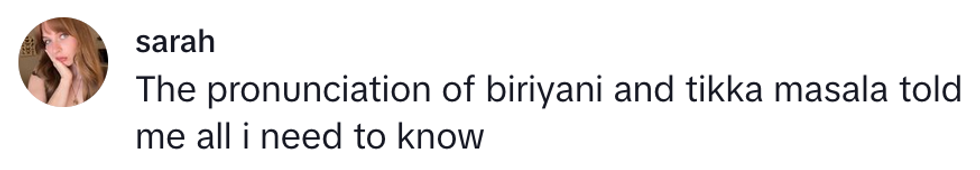 "I could name 15 better Indian restaurants right now, including the 'briyani' cart outside of my apartment," the voice says, mispronouncing the proper dish name for "Biryani."