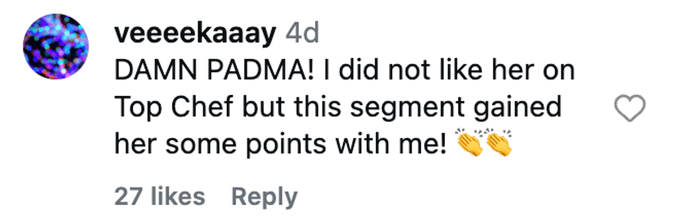 The audience quickly picked up on the absurdity of the scenario as Lakshmi continued dissecting the meal. For her, the issue wasn’t just the ranch—it was the surprisingly narrow view of vegetarian cooking.