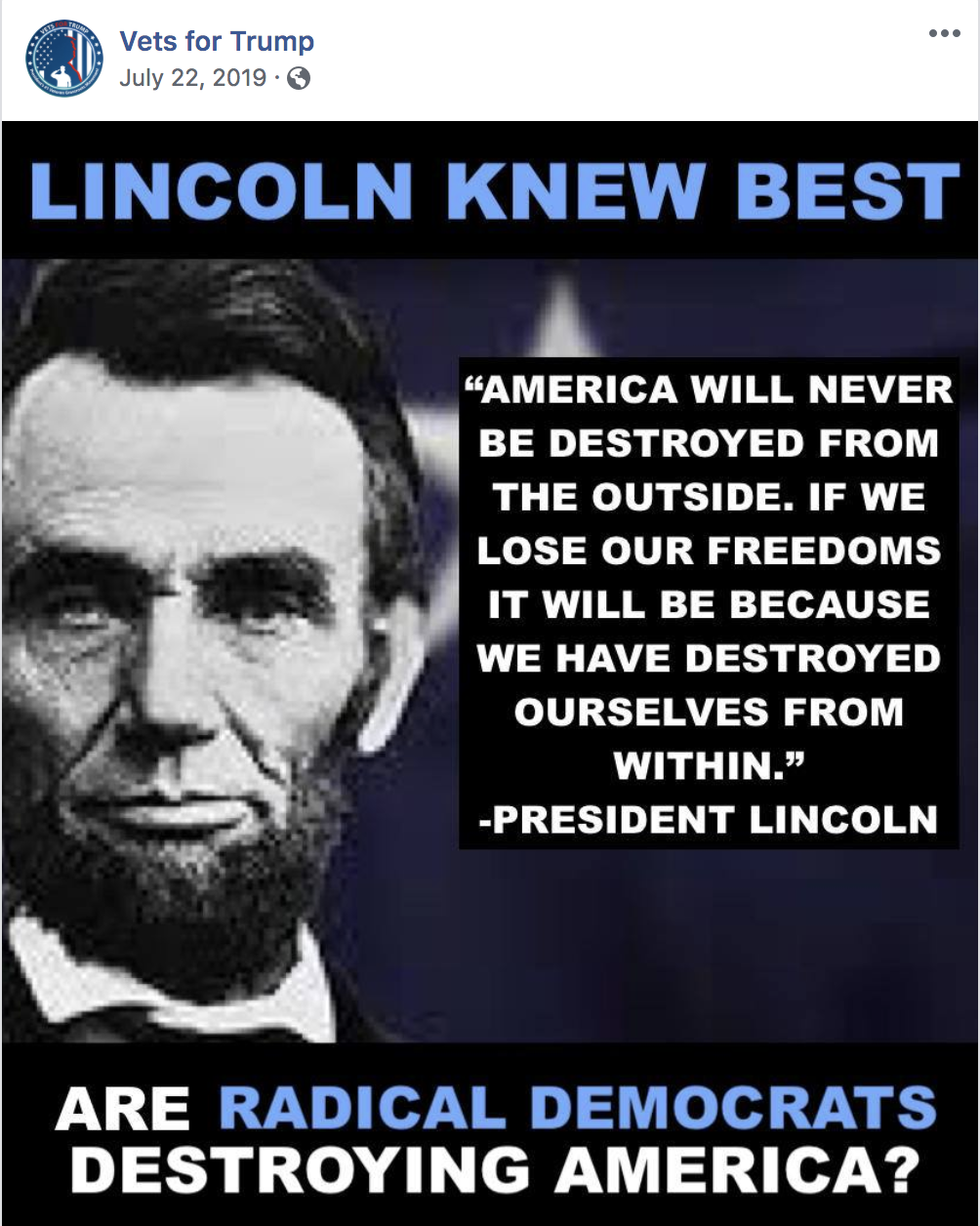 Reporting from PolitiFact indicates that the false quote attributed to Lincoln may have emerged from a July 22 right-wing internet meme that claims "Radical Democrats" are destroying the United States.