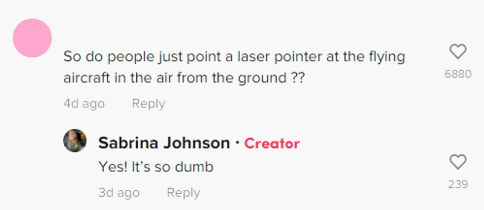 Pilot Sabrina Johnson, or @sabrinaleej on TikTok, explained that lasering airplanes was not only a rising issue, but the consequences for doing this are escalating.