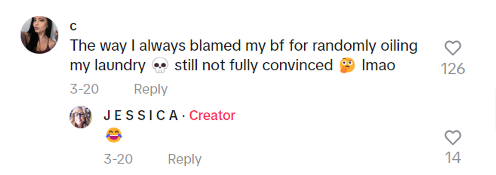 Jess then swooped in with a stitched video to Sam's, stating that she had experienced the same oil stains when her son came home from college for a visit and began doing his laundry in her home. It reached a point where Jess was considering buying an entirely new machine!