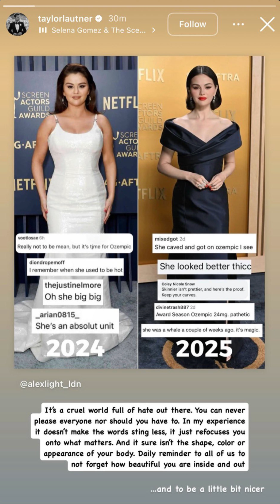 Before coming to his ex's defense, Lautner shared a post of influencer Alex Light commenting on the contradictory reporting of Gomez's physical appearance at the SAG Awards compared to last year's event.