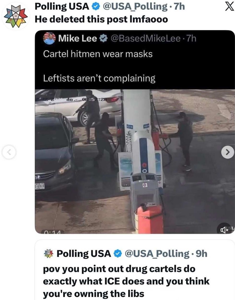 Lee deleted his latest social media blunder because too many people pointed out his comparison of cartel hitmen to MAGA Republican President Donald Trump's ICE wasn't the gotcha to "leftists" that he intended.