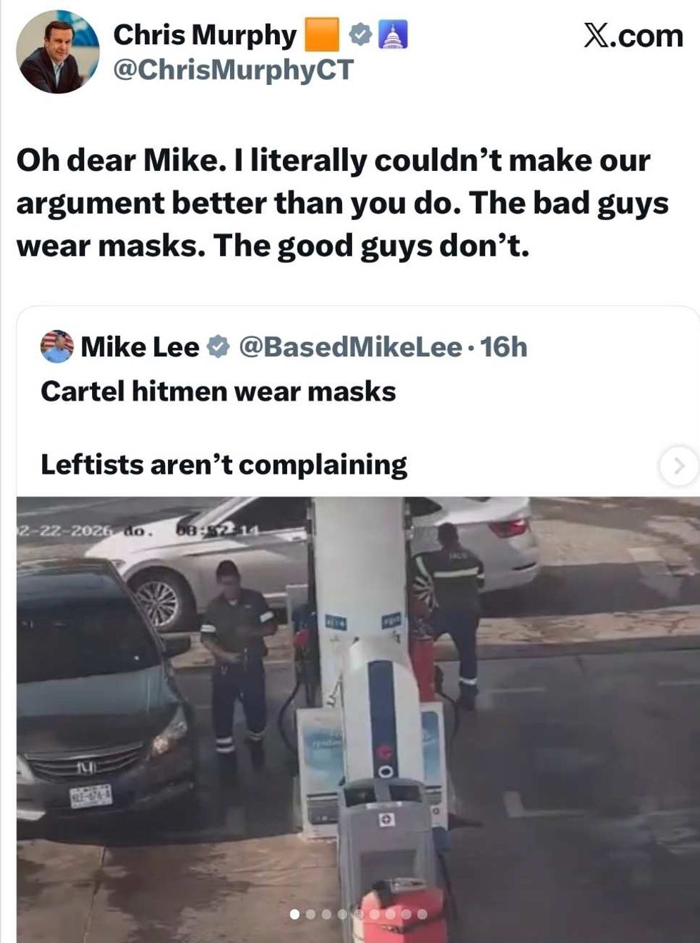 Lee shared a video clip on X of men in masks—either cartel hitmen or ICE agents, he didn't specify which they were—getting gas.