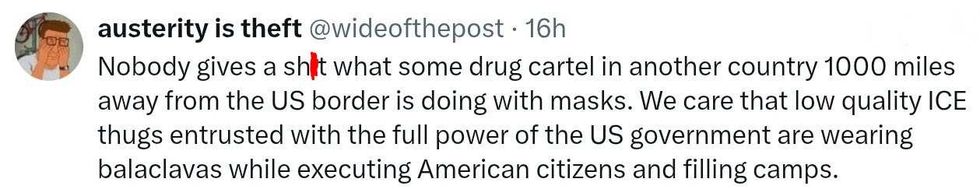 "Yes. Cartel hitmen wear masks. That’s why ICE shouldn’t."