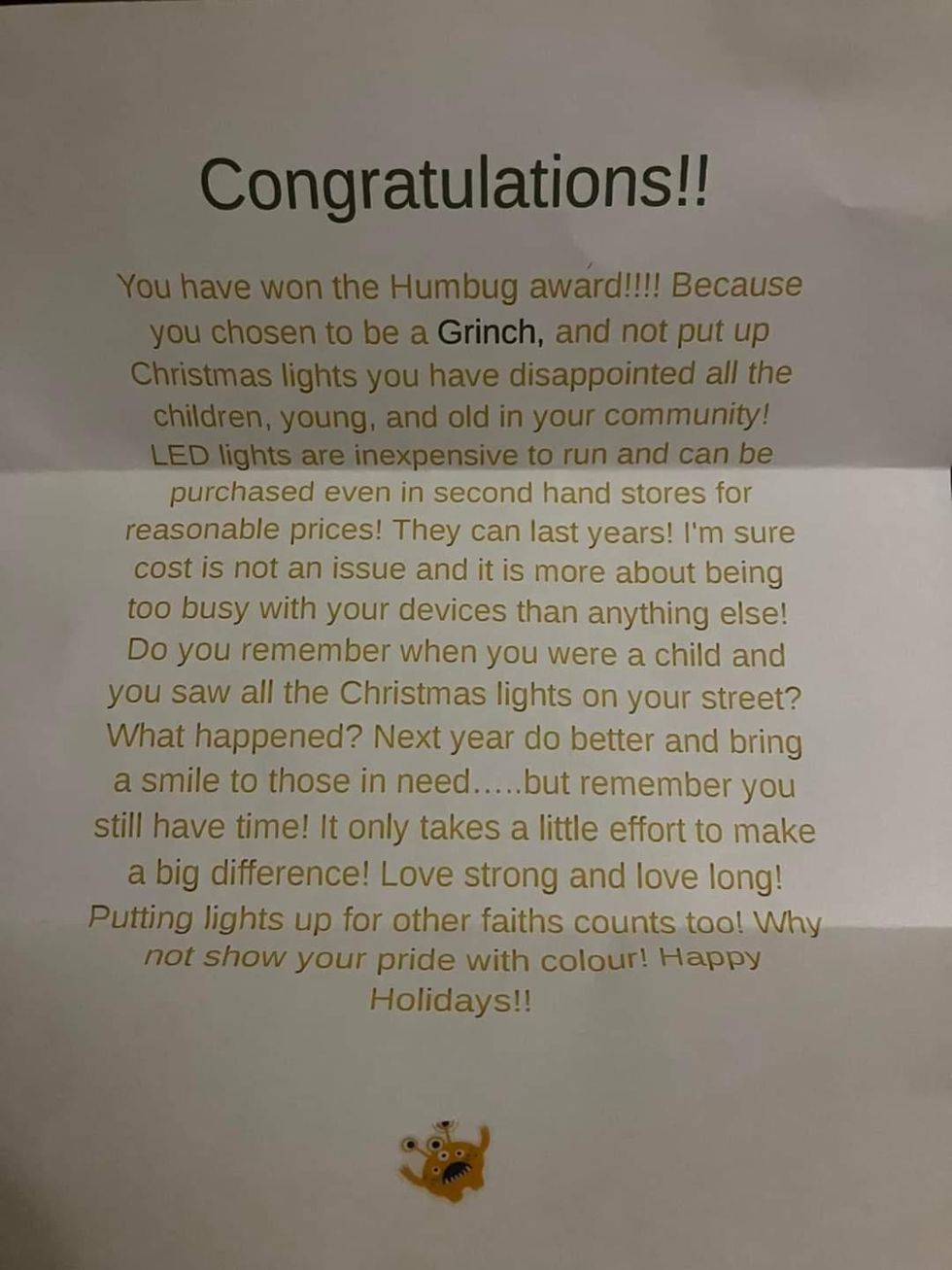"You have won the Humbug award!!!! Because you chosen [sic] to be a Grinch, and not put up Christmas lights you have disappointed all the children, young, and old in your community!"