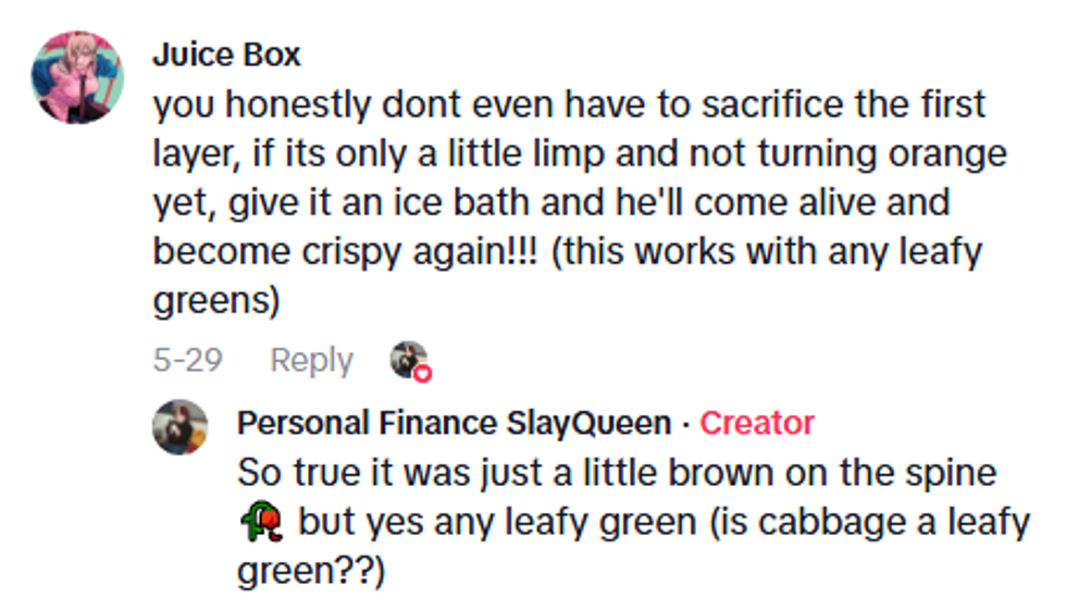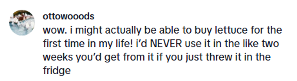 Specifically addressing fellow consumers' lettuce and other leafy green woes, she shared her hack on TikTok for how she keeps the same head of lettuce fresh in the fridge for two months.