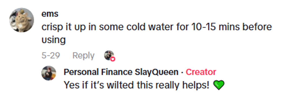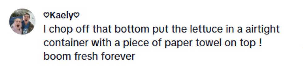 The TikToker explained that she simply kept the lettuce in the bag that she'd purchased it in, but she also added a dampened paper towel to the end of the lettuce where it had been cut from the root. She added in a comment that she would periodically check the dampness of that paper, and if it became too dry, she added a few drops of water but did not need to replace the paper.