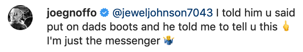 "I told him u said put on dads boots and he told me to tell u this 🖕," he wrote, adding, "I'm just the messenger 🤷♂️."