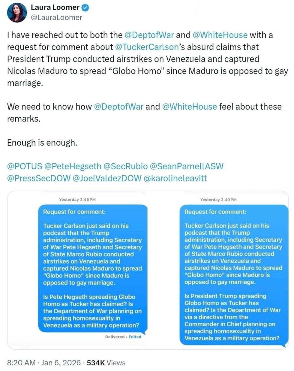 "I have reached out to both the @DeptofWar and @WhiteHouse with a request for comment about @TuckerCarlson’s absurd claims that President Trump conducted airstrikes on Venezuela and captured Nicolas Maduro to spread 'Globo Homo' since Maduro is opposed to gay marriage."