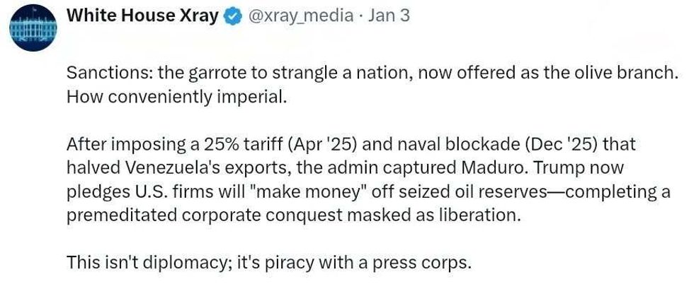 While the White House claimed their January 3, 2026, invasion was about justice, most national and international analysts say it was about Trump seizing Venezuela's oil.