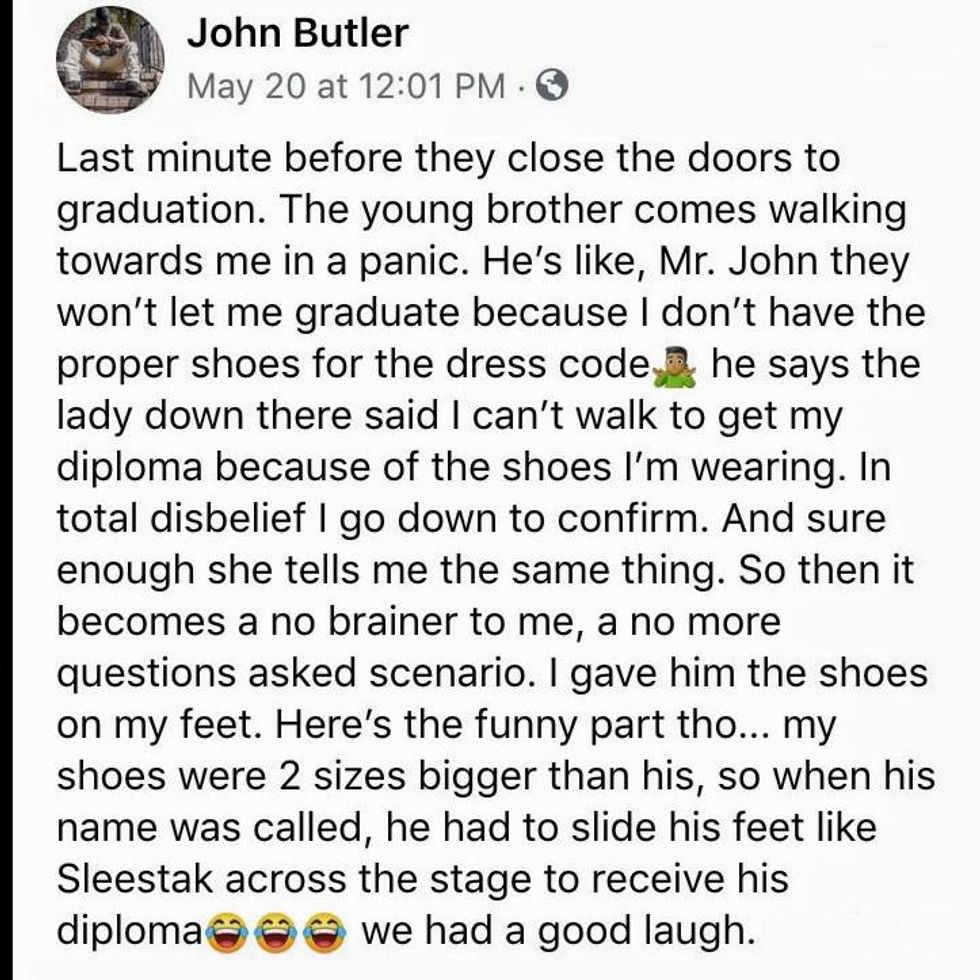 Fortunately, John Butler—a teacher at the school whose daughter was also graduating that day—saw Peters in a panic and without hesitation gave the graduating senior the shoes off his feet.
