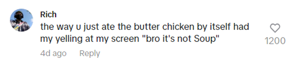 The one issue was that he clearly didn't know how to prepare the dish, as he did not pour the butter chicken over rice or dip the naan into the chicken, eating everything separately instead.
