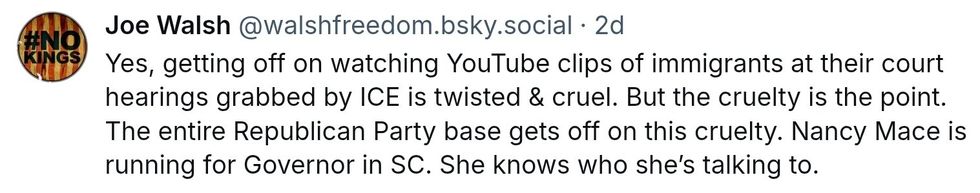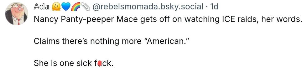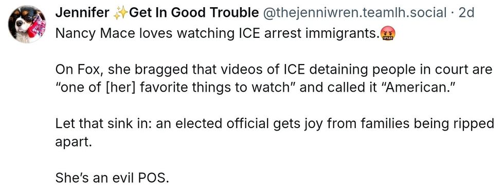 South Carolina MAGA Republican Representative and perpetual "pick me!" girl Nancy Mace told Fox News she watches videos of Immigration and Customs Enforcement (ICE) abductions to relax.