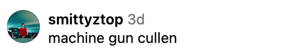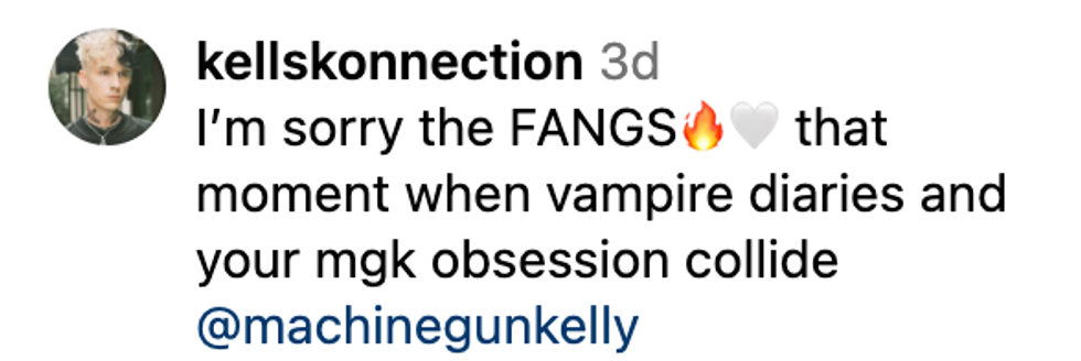 Of course, fangs would be an appropriate choice for Kelly, who garnered a bit of buzz on social media after his wife Megan Fox revealed the two "drank each other's blood" after Fox said "yes" to his proposal.