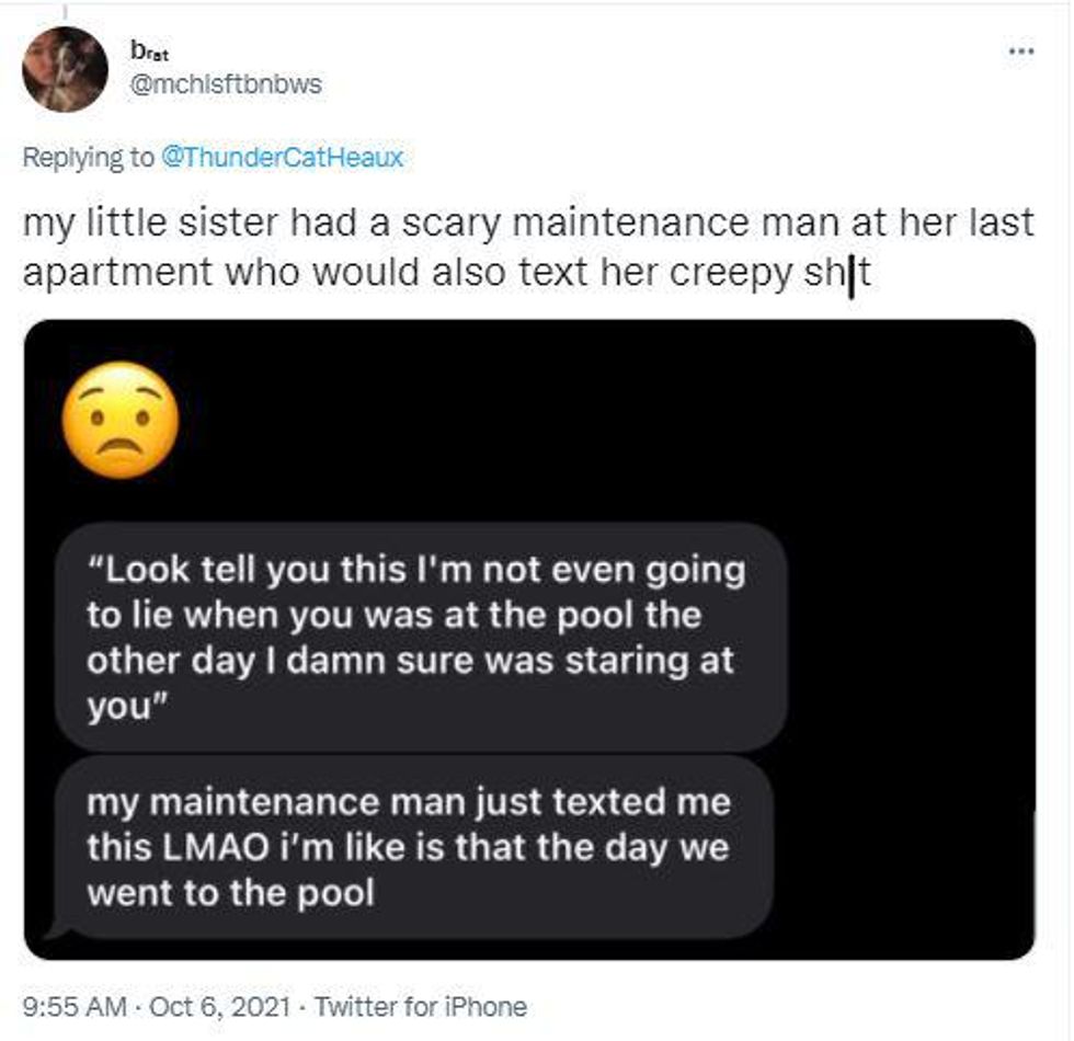 Maintenance man at my last apartment:pic.twitter.com/cu28tjSEdl— \u2728Louisiana Bee\u2728 (@\u2728Louisiana Bee\u2728) 1633354443