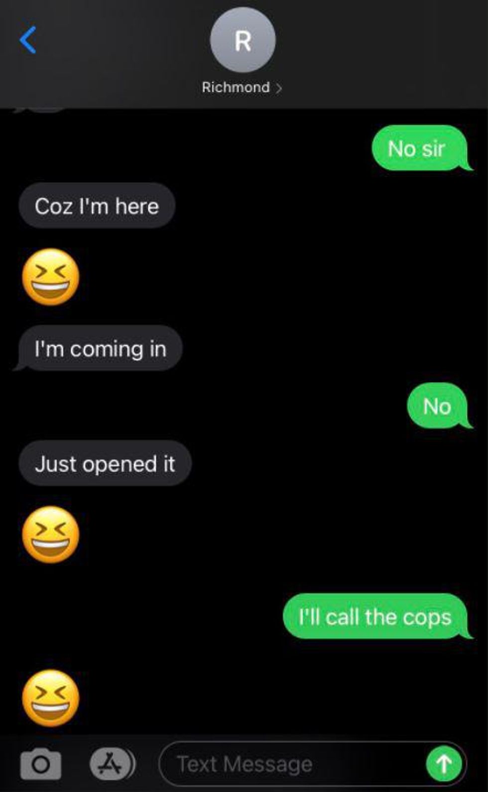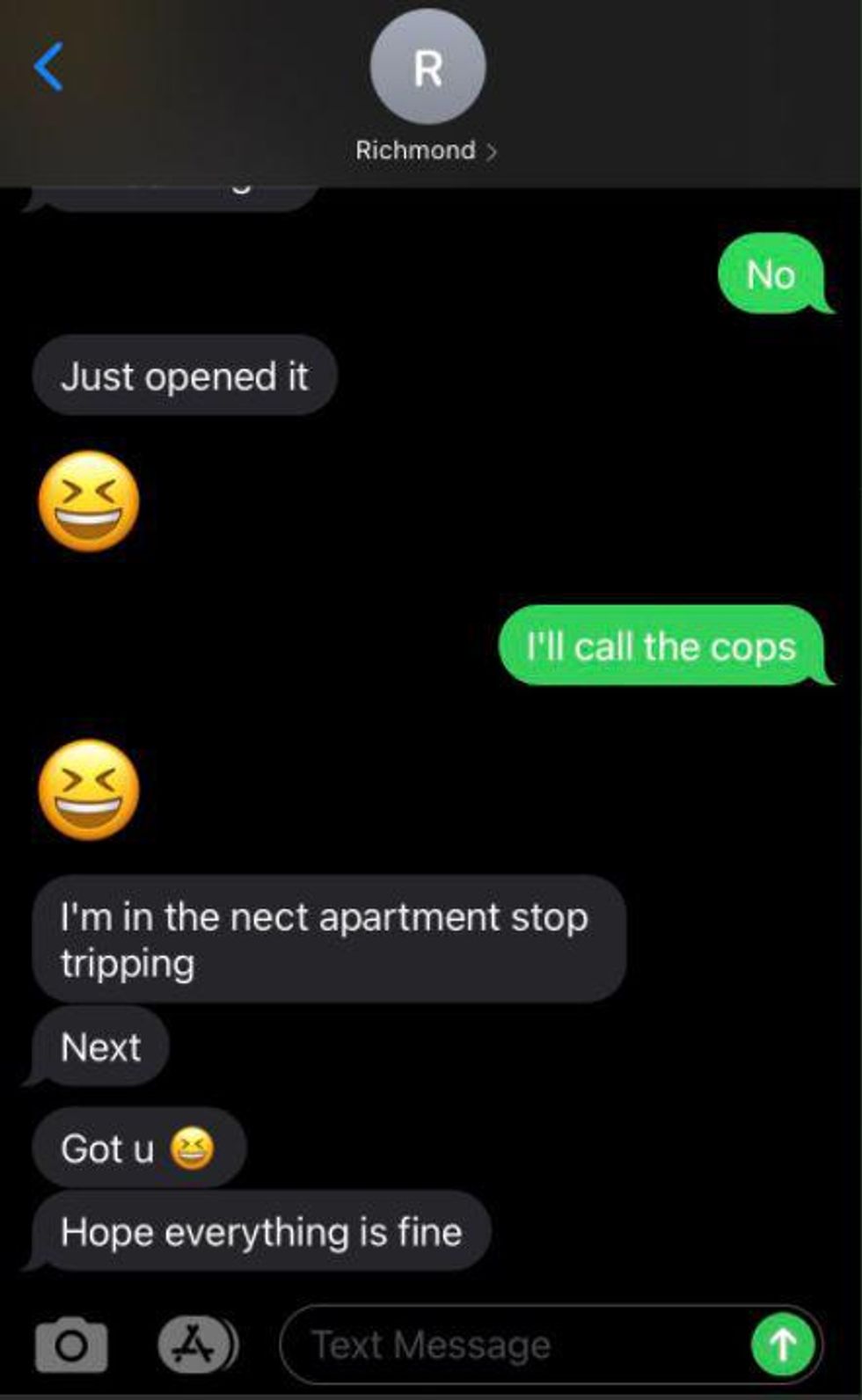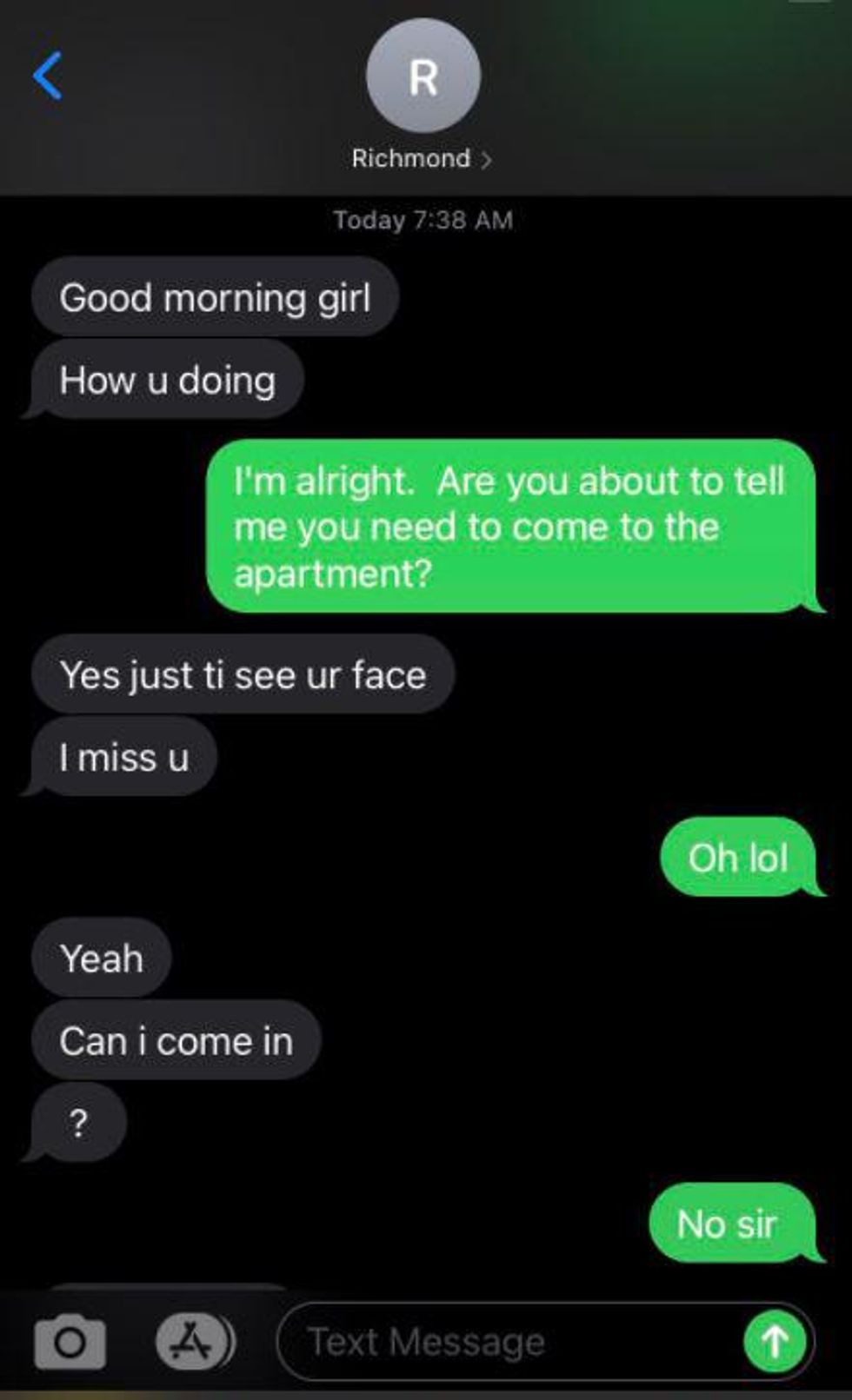 Bee's neighbor had just moved out, so she wasn't surprised to get a "How are you?" text from the maintenance man who may have needed to enter her apartment to fix something shared between the two units.
