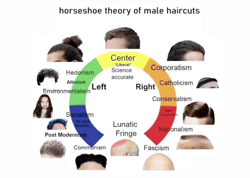 The right side is much more straightforward, going from the slicked-back look of corporate capitalist sociopaths like American Psycho's Patrick Bateman, to the buzzcuts beloved by neo-Nazis.