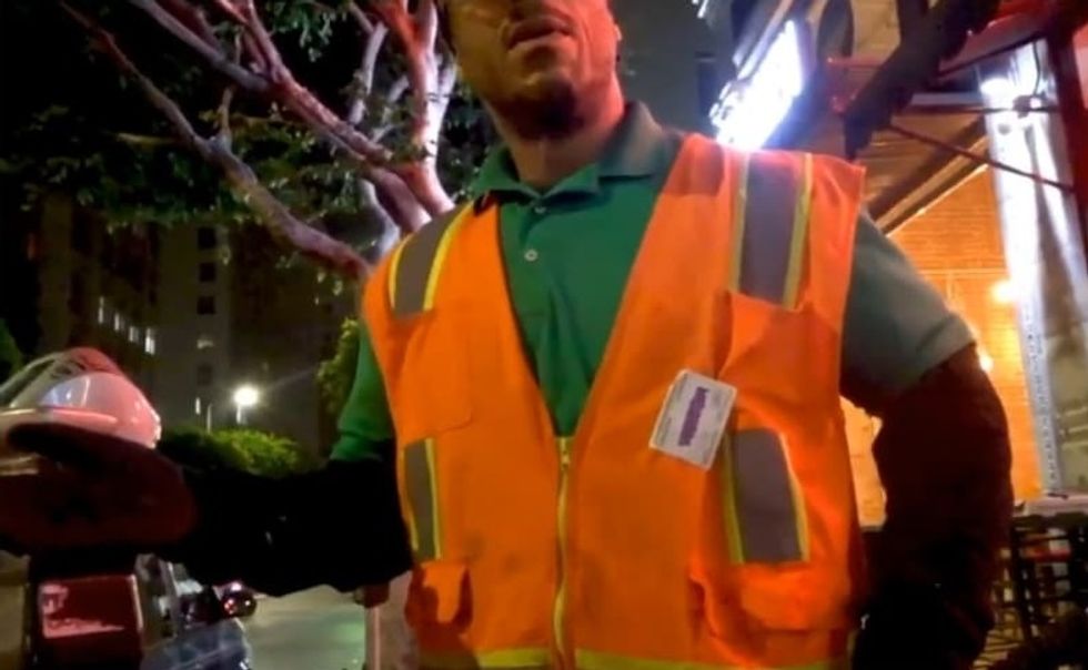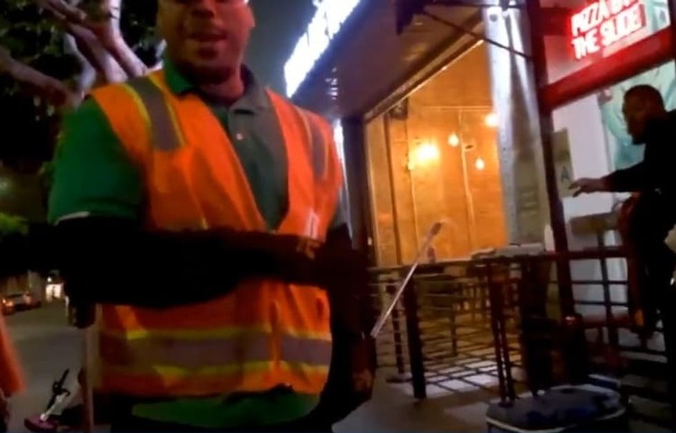 The video opens centered on a city employee who is trying to clean off sidewalks. The man behind the camera moves towards him and the employee attempts to redirect him to a safer area. It's obvious that the employee, who is focused on his work, does not initially realize the man with the phone has an issue with him.