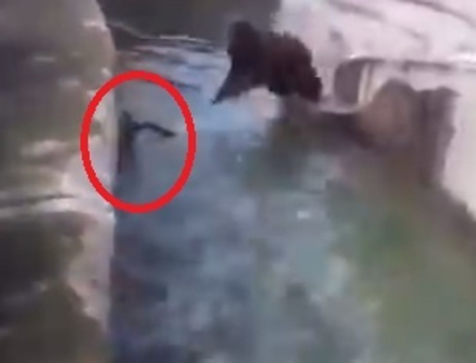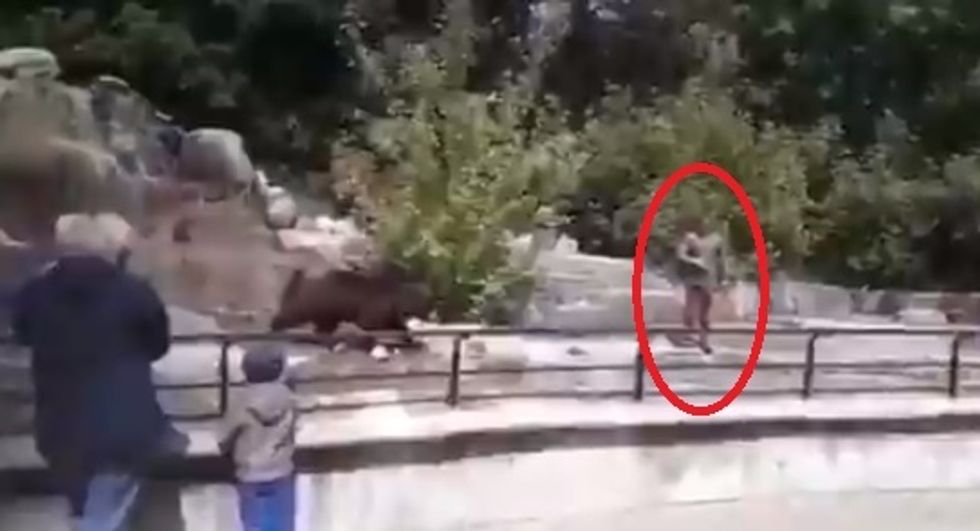 The bear makes a half-hearted charge towards him and he takes a few steps forward before jumping into the safety moat around the animal's enclosure. Presumably this is how the man got into the bear's enclosure in the first place. An old man and young boy casually watch because, like we said, surreal.