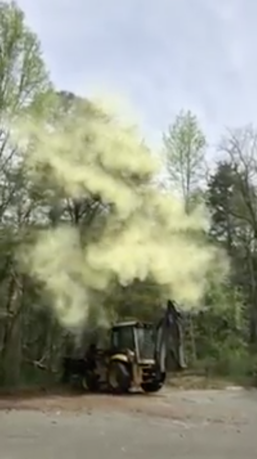 With his wife Jennifer filming the demonstration, Eric Henderson grabbed his backhoe loader and merely tapped a tree weighed down with pollen.