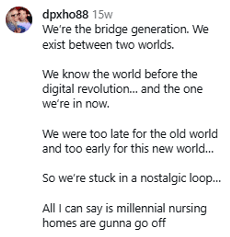Millennials are stuck looking back, feeling grief for what they were promised and did not receive, but also feeling nostalgia for the life they grew up with that they'll never be able to replicate, because it predates the digital age and the pandemic.