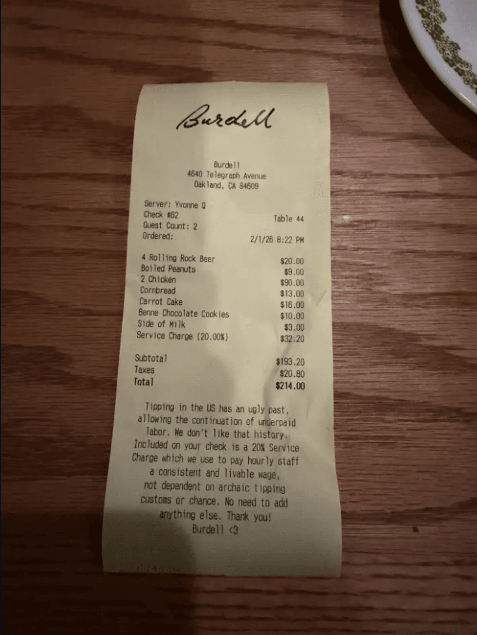 The Burdell staff also printed a note at the bottom of the receipt, describing the service charge:
