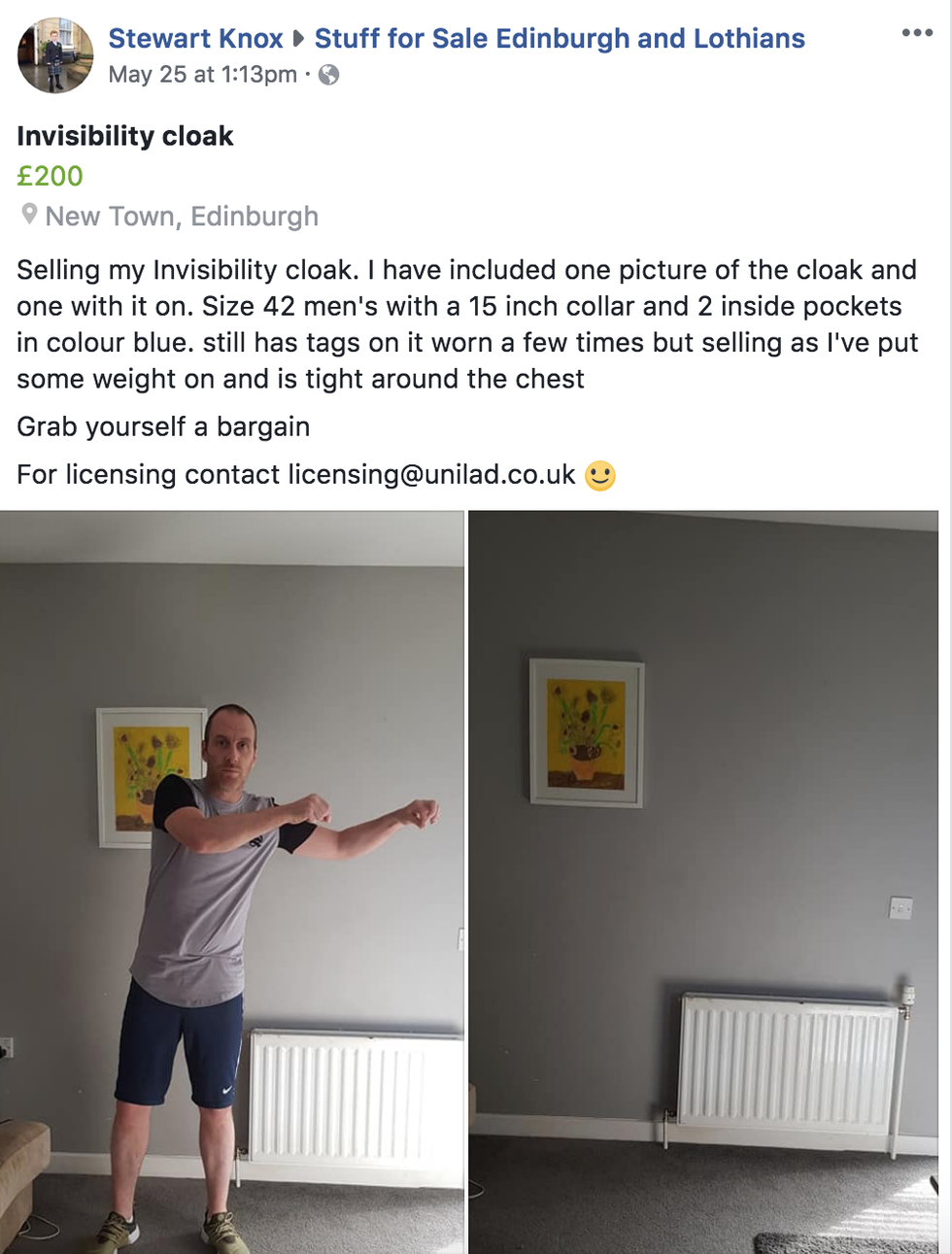 Facebook "stuff for sale" groups are, for the most part, a nuisance. They clutter our notifications while rarely offering anything of value to our lives. Stewart Knox changed this, however, with an amazing product: an invisibility cloak, the likes of which has never been seen outside of Hogwarts.
