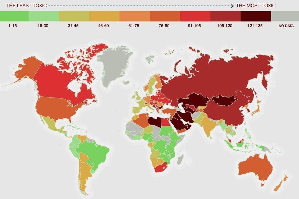 In another map, showing which countries were voted the most toxic, the US didn't do so well either. We scored in the 71-90 range, which means we are seen as pretty toxic.