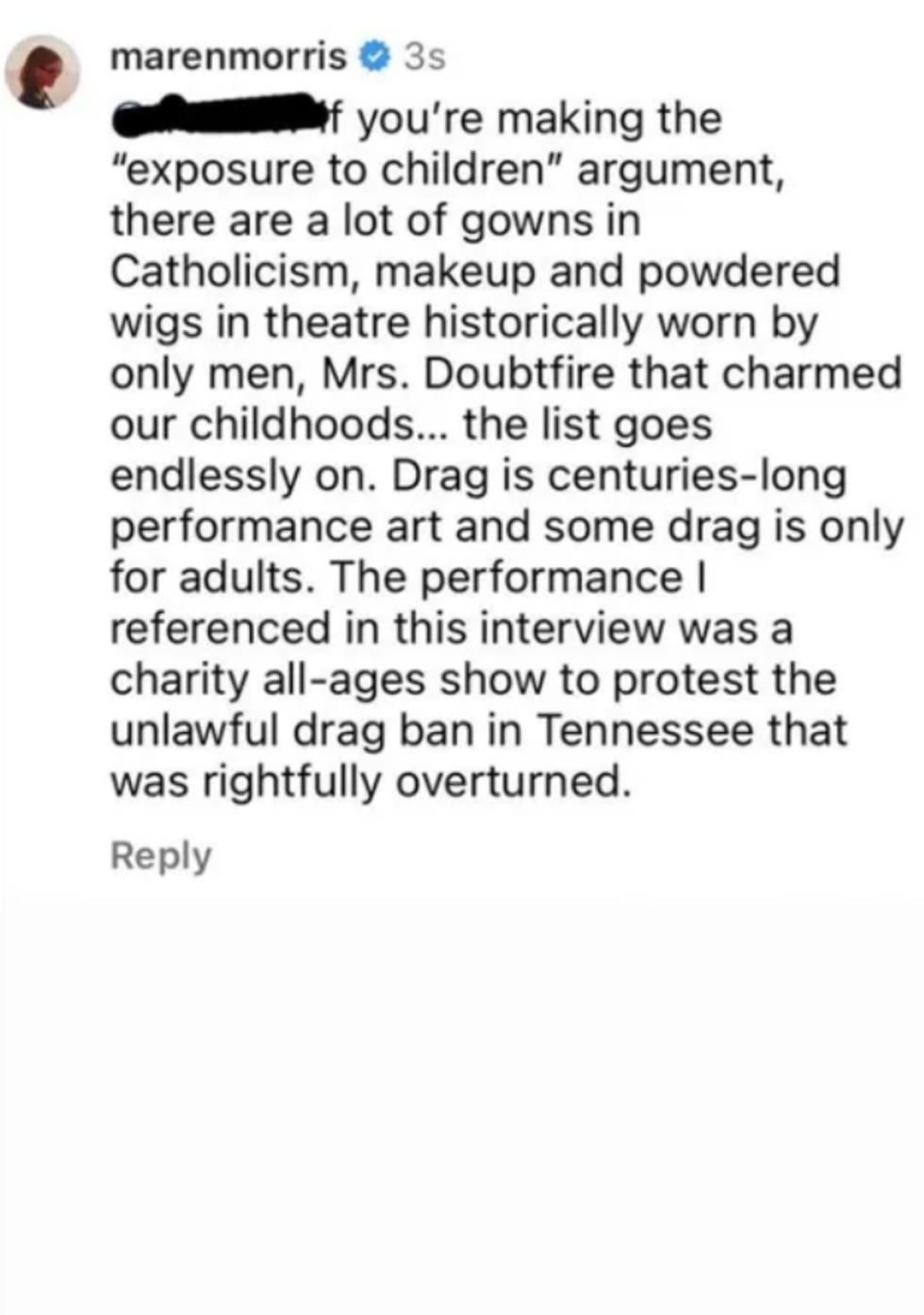 "The performance I referenced in this interview was a charity all-ages show to protest the unlawful drag ban in Tennessee that was rightfully overturned.”