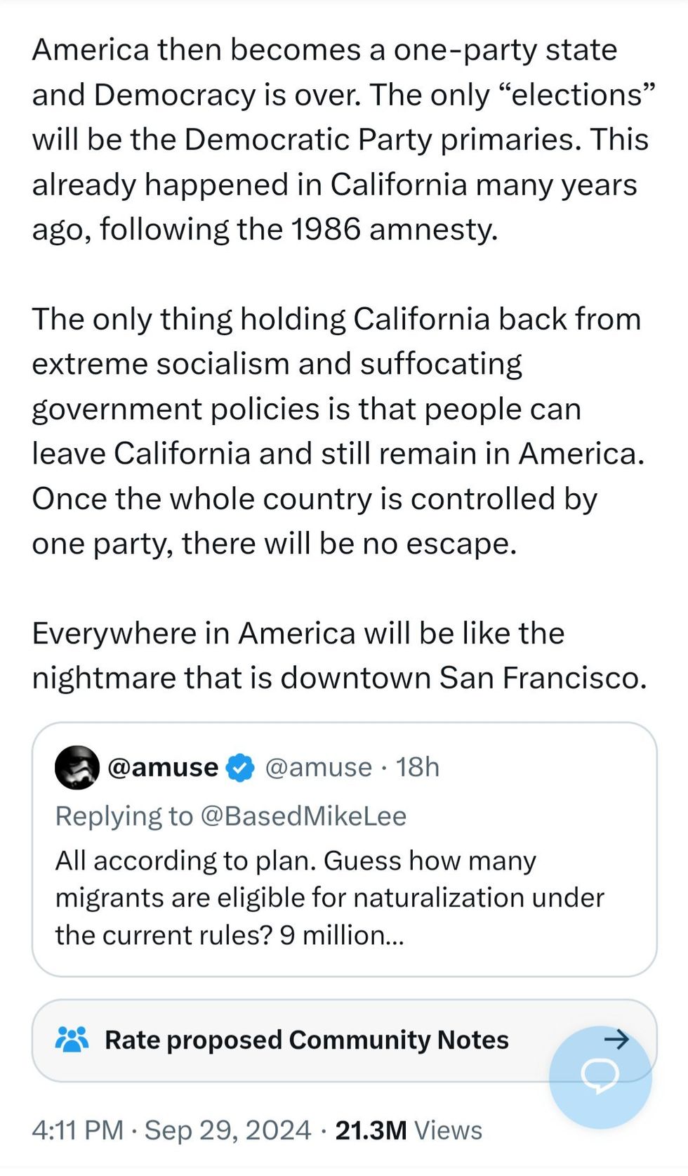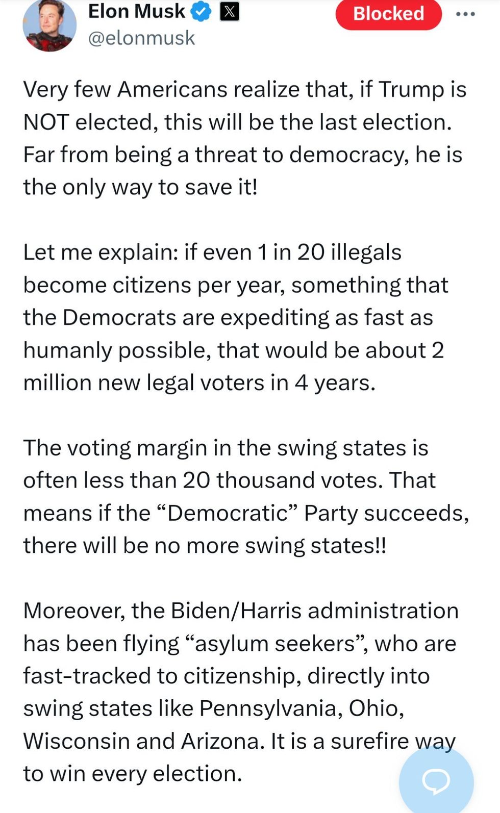 In a rambling tweet Musk bloviated about baseless xenophobic conspiracy theories about "illegals" supposedly voting illegally in a massive fraud scheme. We won't be dignifying his post by linking to it, but you can read it in the screenshots below.
