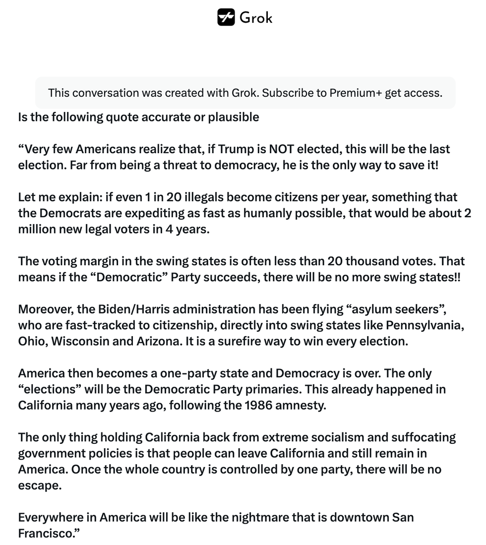 Elon Musk's descent into far-right madness has reached a fever pitch over the course of the election. But it turns out the rhetoric he's spewing is so nonsensical that even his own technology doesn't believe it.