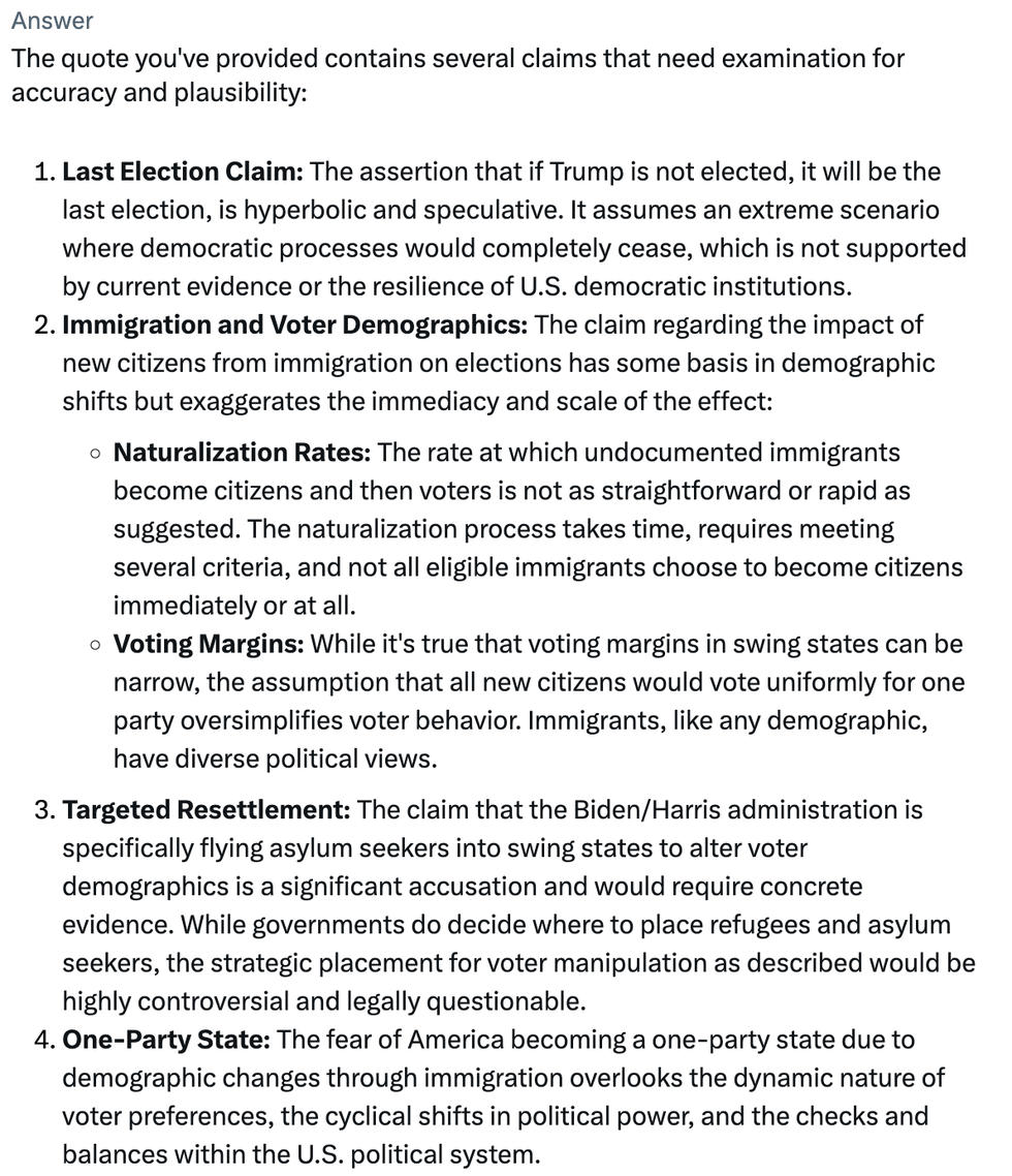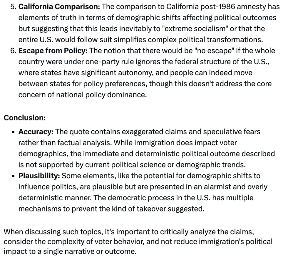 The tweet then went on to include Grok's analysis of Musk's claims, which the AI tool found to contain "exaggerated claims and speculative fears rather than factual analysis" that were "presented in an alarmist and overly deterministic manner."