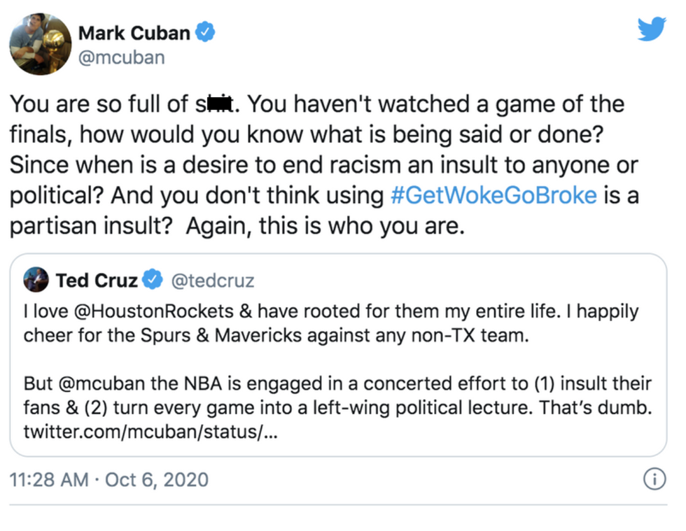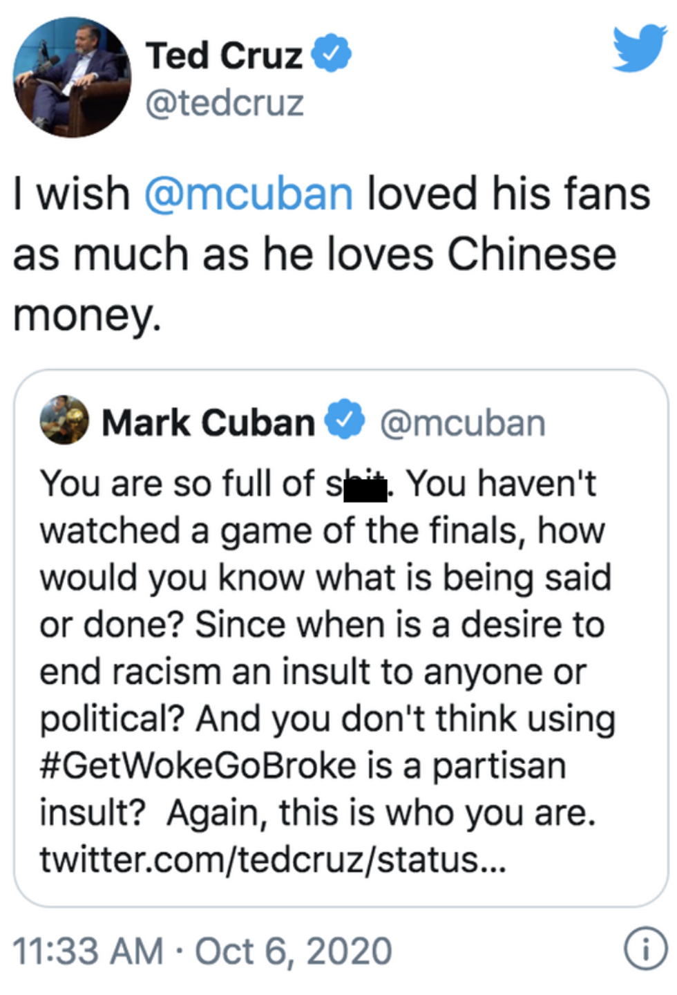 That's when Mark Cuban, owner of the Dallas Mavericks, took Cruz to task for the tweet.